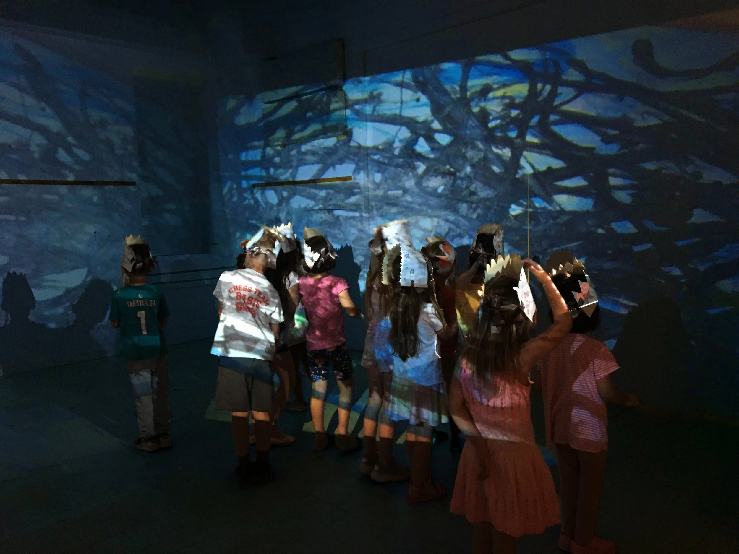 Participants gather in a room filled with a soundscape of water and meditative voice instructions. Using elongated brushes, they collaborate on gestural line drawings on recycled packing paper, marks fluid, reflecting the water they observed. Cameras capture accumulating marks and project them onto surrounding walls in real time. Individual marks become shared. The voice guide offers invitations: "Your lines are your own, you have autonomy." "Can you intersect another person's lines?" Our movement and our stillness determine the rhythm of our experience.